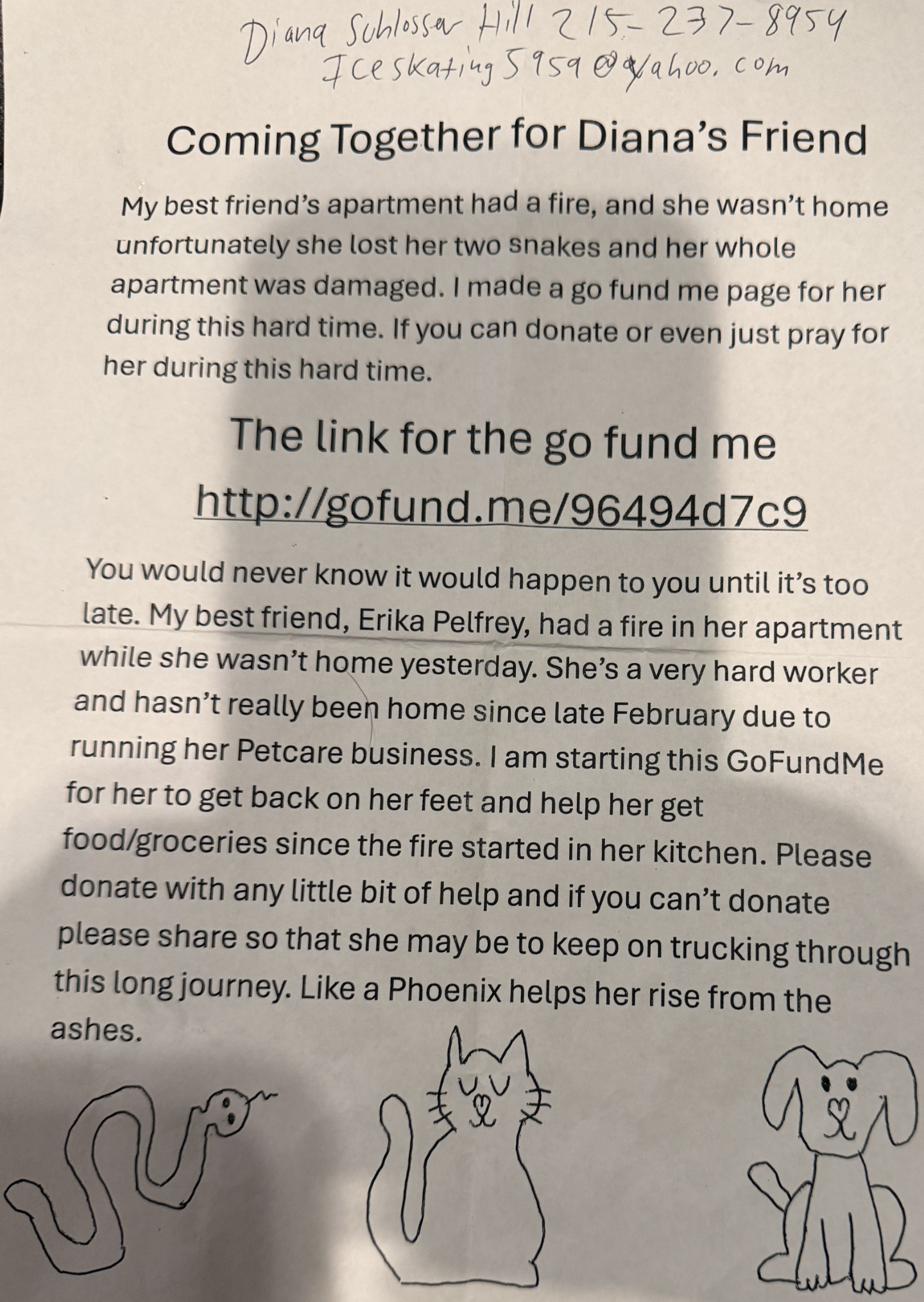 ”You would never know it would happen to you until it‘s too late. My best friend, Erika Pelfrey had a fire in her apartment while she wasn‘t home 3/16/26. She‘s a very hard worker and hasn‘t even really been home since late February due to running her Petcare business. I am starting this GoFundMe for her to get back on her feet and help her get food/groceries since the fire started in her kitchen. Please donate as any little bit helps and if you can‘t donate please share so that she may be to keep on trucking through this long journey. Like a Phoenix help her rise from the ashes.“